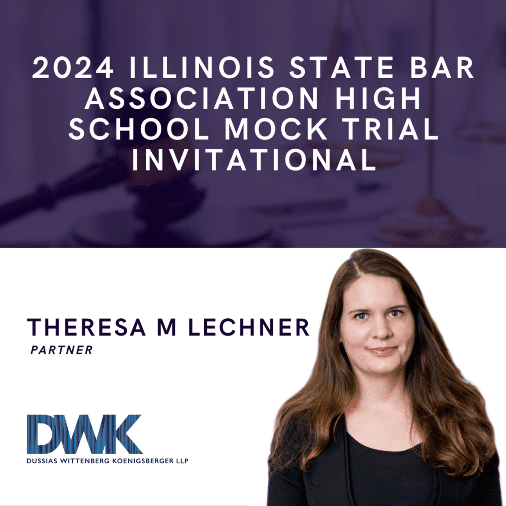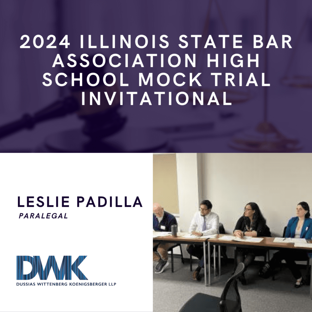 On March 16 through 17, 2024, the Illinois State Bar Association (ISBA) presented its annual High School Mock Trial at the University of Illinois, Springfield. ISBA invited high school students throughout the State to participate, and fifty high schools participated in the invitational this year DWK Partner Theresa Lechner, Associate Attorney Michele Moreshi, and Paralegal Leslie Padilla served as jurors/evaluators at this year’s event. The mock trial allows high school students to learn what it is like to prepare and present a legal case before an Illinois court. College Preparatory School of America, Lombard, won first place. Stevenson High School, Lincolnshire, won second place. Maine South High School, Park Ridge, won third place.